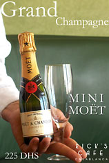 Champagne flows in the film, whether it’s the last bottle at the Café Aurore in Paris, Captain Renault’s memorable order for Major Strasser’s table: “Waiter, a bottle of Veuve Clicquot 1926, a very good wine,” or the numerous champagne cocktails ordered throughout, champagne was destined to play a major role in the new production of Rick’s Café. Champagne by the glass became a staple at the bar, accompanied by a full range of spirits and cocktails – including dry martinis, traditional margaritas, mojitos and caipirinhas, not to mention our house cocktail, the “Sour Jdid.” Named after our street, Boulevard Sour Jdid (Arabic for “new walls”) the name, to non-Arabic speakers seemed an allusion to a sour cocktail, hence our concoction of a whiskey sour, with red vermouth replacing sugar for just a slight sweet touch. |