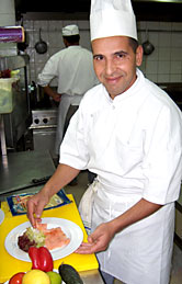| The Chef at Rick’s Café has a major role in ensuring that the menu not only follows, but adds and enhances the elegant yet eclectic ambience. It is a welcome challenge for a chef who loves to cook to reveal the art of a dish in a simple presentation, rather than disguising food in sculptures or dominating sauces. In keeping with the values of quality and freshness of ingredients, the Chef is very selective of suppliers. For instance, steaks are very popular, and while the sour-cream topped baked potato and Rick’s steak sauce are a novel touch, it’s the quality of the meat that sets our steaks apart. In the U.S., steaks from Nebraska are the finest, so it was a great compliment to the chef when the visiting CEO of an Omaha-based company said he hadn’t had a T-bone as good in years. Fish is the speciality of our chef, and whether the dish is John Dory with cepes, fish and chips or Monkfish Japanese-style, the fish is guaranteed fresh and garnished with vegetables of the season. Constantly coaching and teaching his team and the service staff, reacting and adapting to sudden changes, trying new recipes, refashioning old ones and coming up with the occasional surprise, our Chef is a real star. |